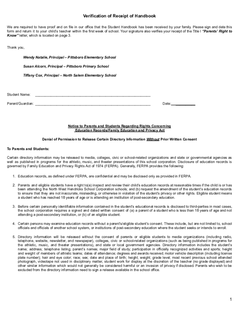 This document serves as proof that a family has received the Student Handbook and includes details about their rights regarding education records under FERPA.