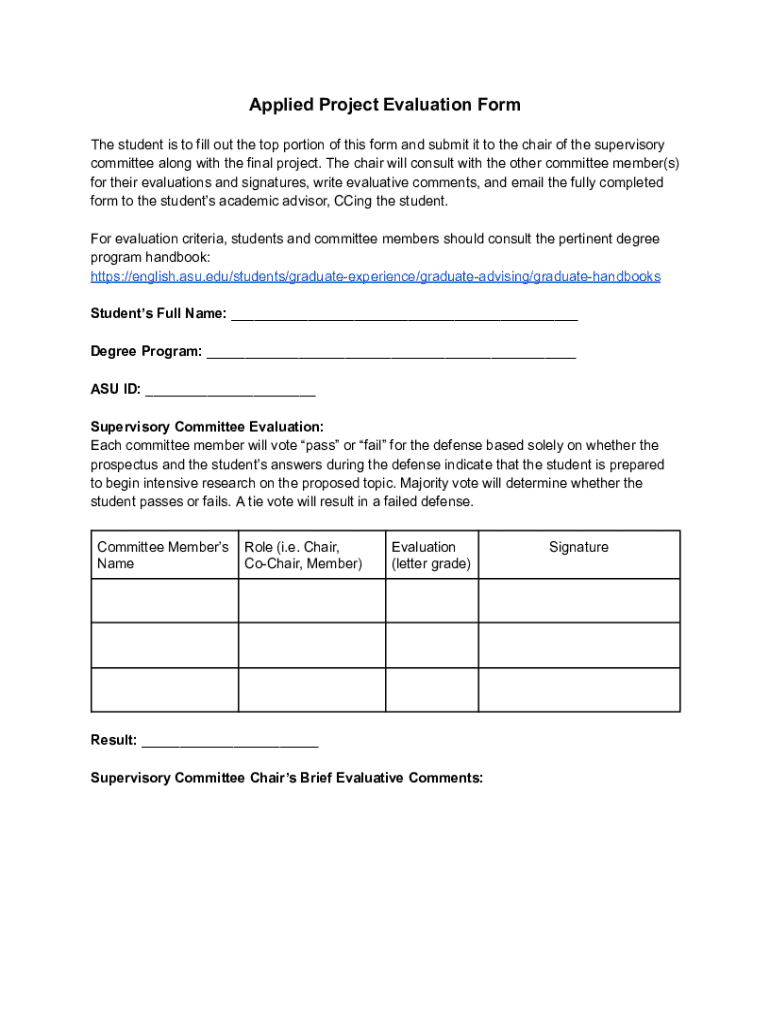 This form is used for the evaluation of a student\'s project defense by a supervisory committee, including evaluations and signatures from committee members.