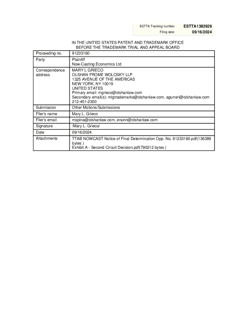 This document provides a final determination in a trademark dispute between Now-Casting Economics Ltd. and Economic Alchemy LLC, detailing the background of the case, motions filed, and the court\'s