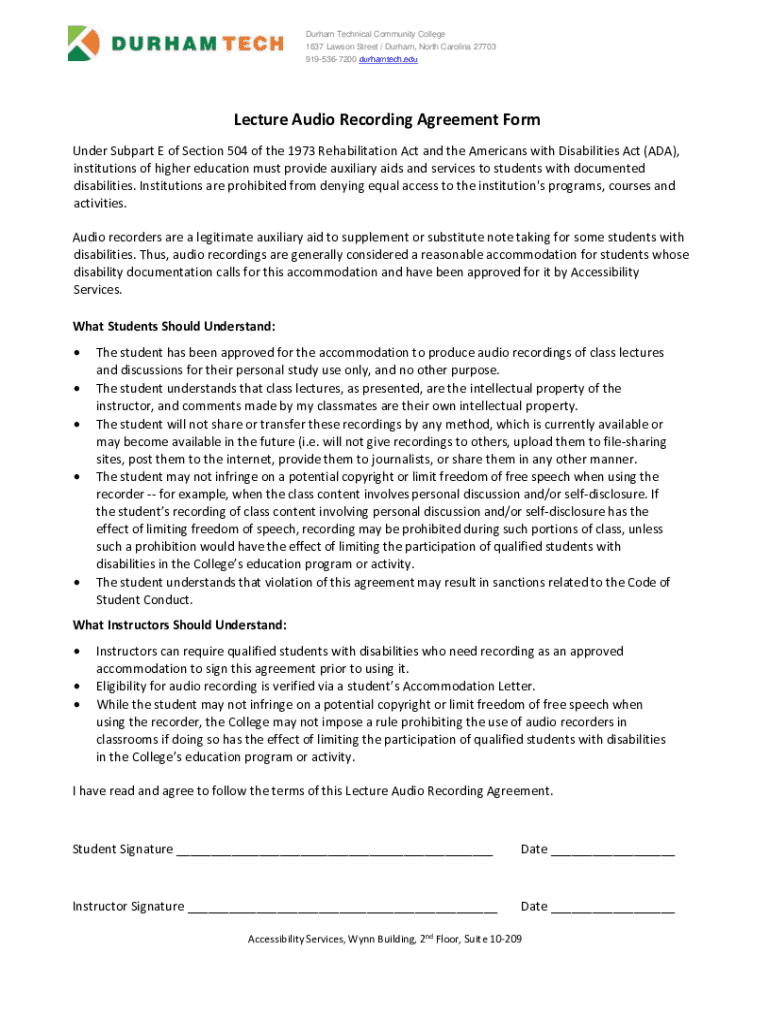 Special circumstances may arise that necessitate specific adjustments to the lecture audio recording agreement form. For instance, students with disabilities may require tailored accommodations to ensure they have equal access to recorded materials. It’s crucial that educators remain flexible in these situations and modify the recordings or the usage of the lectures per each student's individual needs.