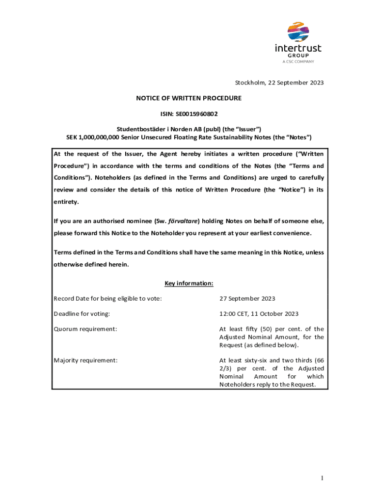 This document serves as a notice initiated by Studentbostäder i Norden AB regarding a written procedure for its SEK 1,000,000,000 Senior Unsecured Floating Rate Sustainability Notes, inviting noteholders