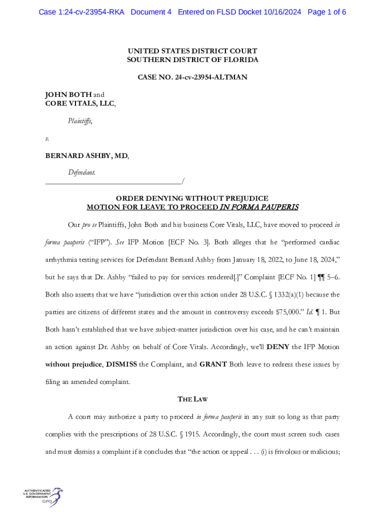 Get the free Order Denying Without Prejudice Motion for Leave to Proceed in Forma Pauperis