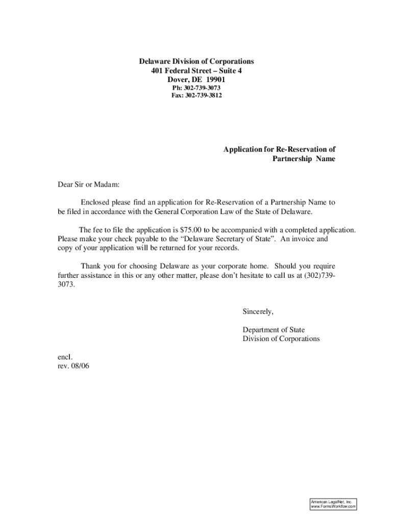 This document is an application form to re-reserve a partnership name in accordance with Delaware\'s General Corporation Law. It includes an application fee and guidelines for submission.