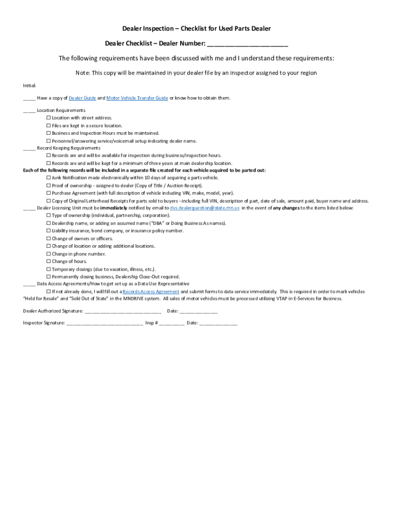 Get the free Dealer Inspection – Checklist for Used Parts Dealer