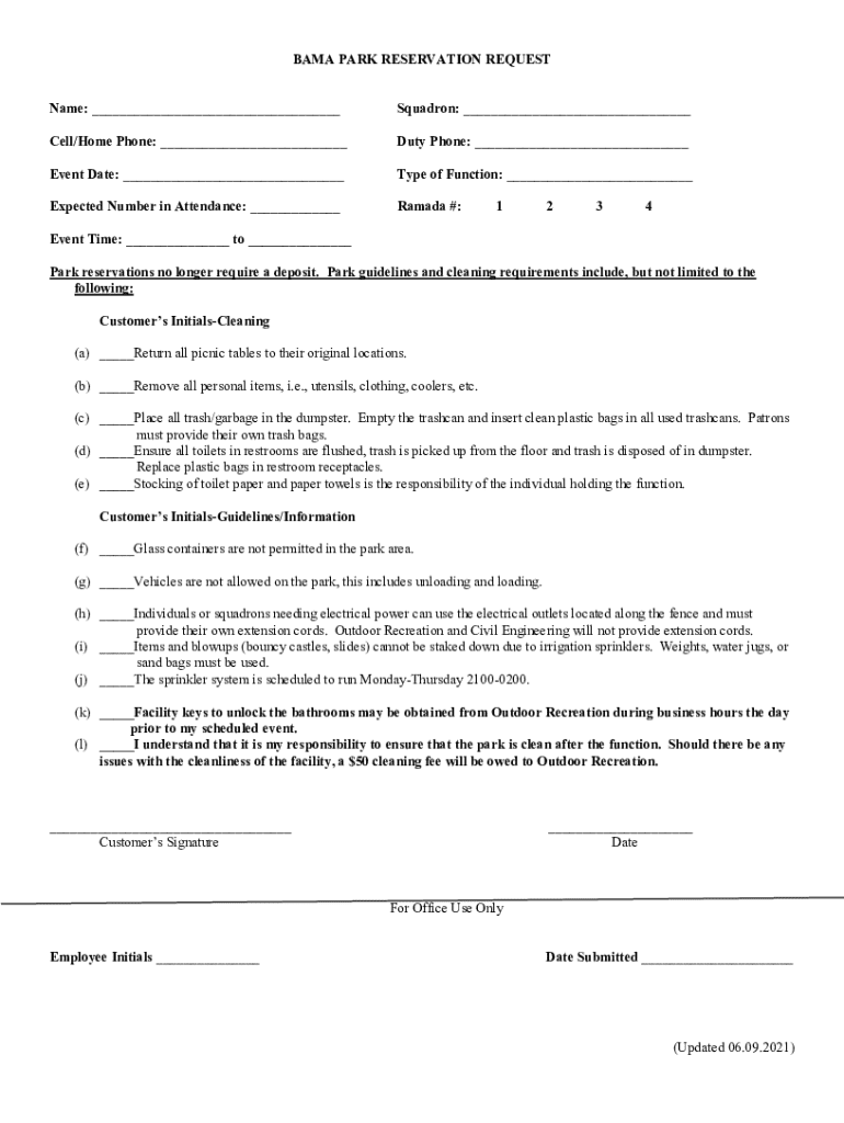 The Bama Park reservation request form is an essential tool designed for individuals or teams looking to secure access to the park's facilities. Whether you're planning a family picnic, a corporate event, or a sports tournament, making a reservation ensures that you have guaranteed space and amenities for your desired date and time. The reservation system helps park officials manage the influx of guests while ensuring a pleasant experience for everyone involved.