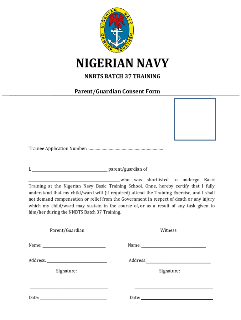 This document serves as a consent form for parents or guardians of trainees undergoing Basic Training at the Nigerian Navy Basic Training School, noting the acknowledgment of risks involved.