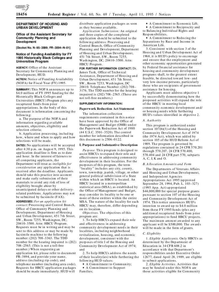 This document announces funding availability for Historically Black Colleges and Universities (HBCUs) to address community development needs, including neighborhood revitalization and housing.