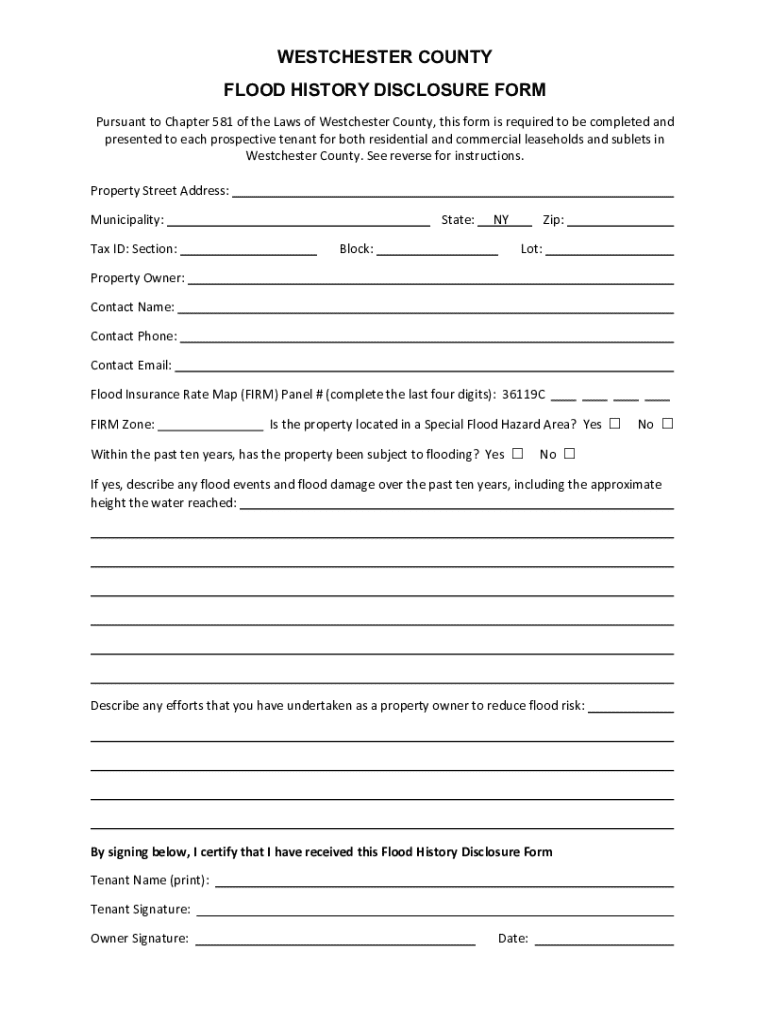 The Flood History Disclosure Law outlines critical requirements for landlords in Westchester County. Under the law, property owners must disclose any past flooding incidents on their premises dating back to 1973. This transparency is crucial for potential renters and buyers to identify potential hazards and evaluate their risks associated with flooding potential.