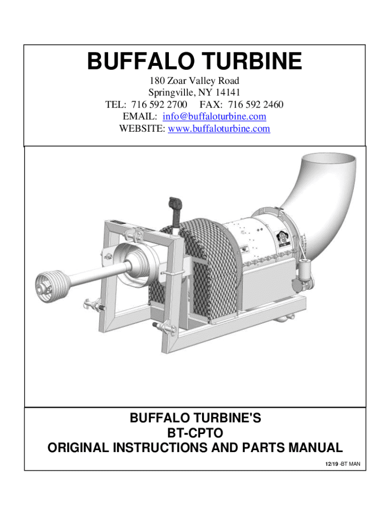 This manual provides operating instructions, safety guidelines, maintenance information, and parts references for the BT-CPTO model debris blower manufactured by Buffalo Turbine, designed specifically