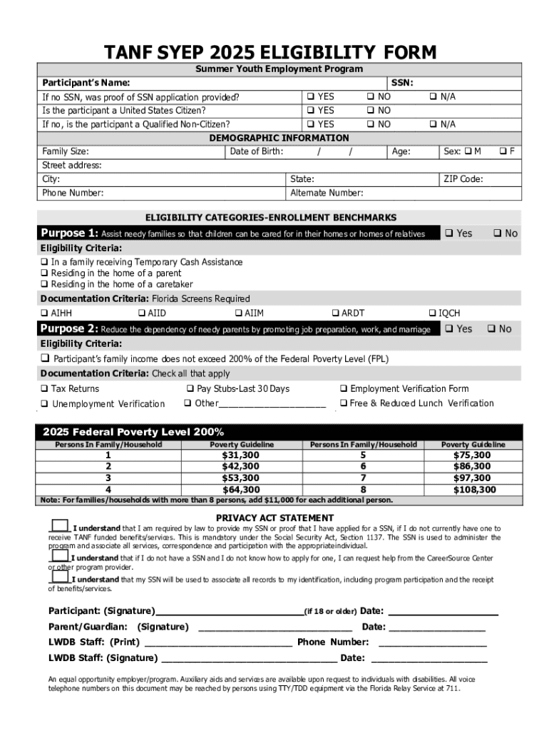 Get the free Tanf Syep 2025 Eligibility Form