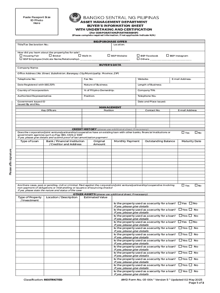The Buyers Information Sheet is a document that includes detailed information related to the identity and financial standing of a buyer involved in a purchase transaction.
