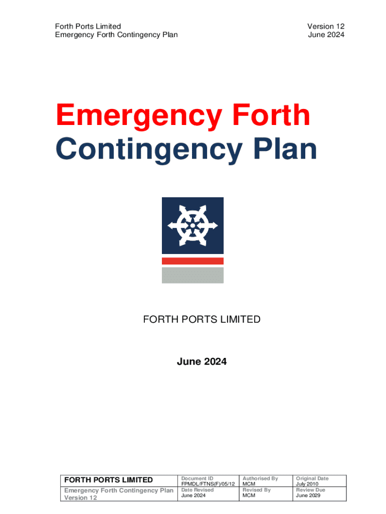 This document outlines the Emergency Forth Contingency Plan developed by Forth Ports Limited to manage shipping-related emergencies in the Firth of Forth, including procedures for response to marine