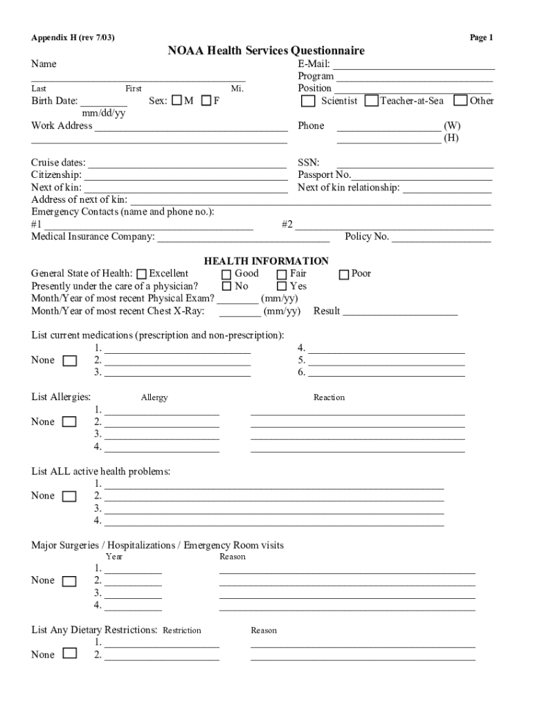 The NOAA Health Services Questionnaire Form plays a crucial role in ensuring the health and safety of individuals involved in NOAA activities. This comprehensive questionnaire is designed to collect essential health information from employees and stakeholders participating in NOAA programs and expeditions.