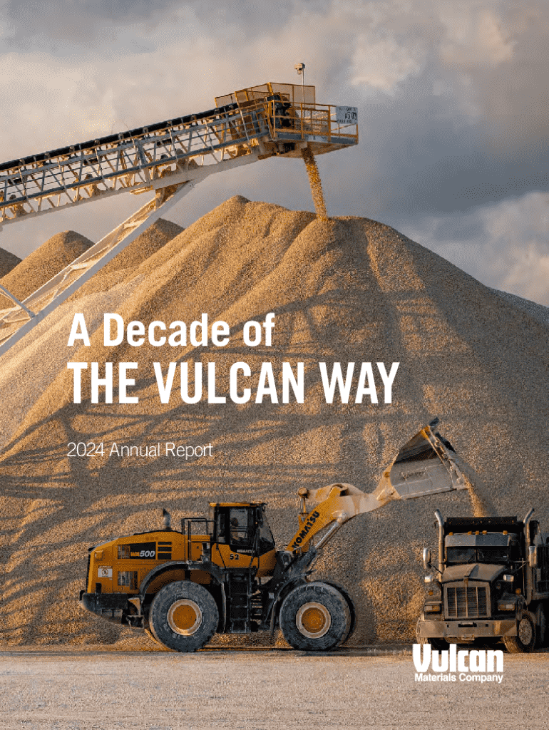 A Decade ofTHE VULCAN WAY 2024 Annual ReportDURABLE GROWTHTHE VULCAN WAY REVENUE CAGR 9%ADJUSTED EBITDA$7.4BCAGR 13%$3.0B2014$600M 2024AGGREGATES VOLUME CAGR 3%162M tons$2,057M220M tons20142024AGGREGATES