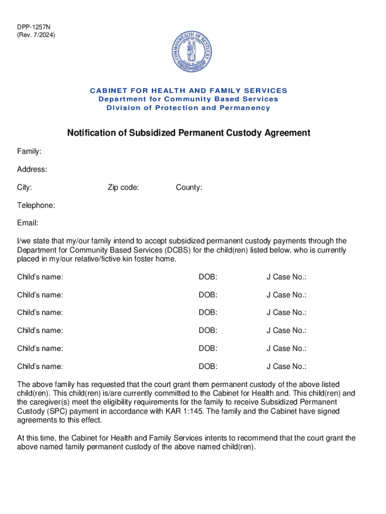 This document serves as a notification for families intending to accept subsidized permanent custody payments for children currently in their care, through the Department for Community Based Services