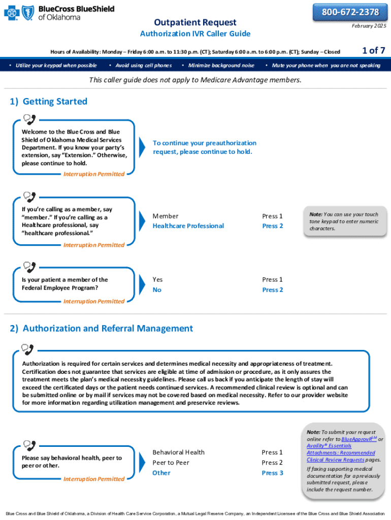 This document serves as a guide for callers requesting outpatient service authorization from Blue Cross and Blue Shield of Oklahoma, detailing the process, necessary information, and interactive voice