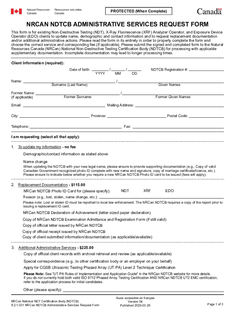 The NRCAN NDTCB administrative services form is critical for managing and tracking various administrative operations within Natural Resources Canada's National Designation and Training Certification Body (NDTCB). This form facilitates everything from application submissions to record management, ensuring streamlined processes for both individuals and teams.