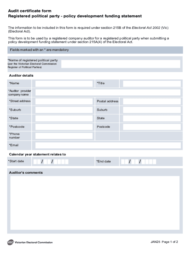 An audit certificate form includes several key components that validate the auditor’s conclusions. The essential elements typically feature the auditor's information, such as their name, qualifications, and the auditing firm they represent. Furthermore, the form captures detailed company information, which includes the company name, address, and contact details.