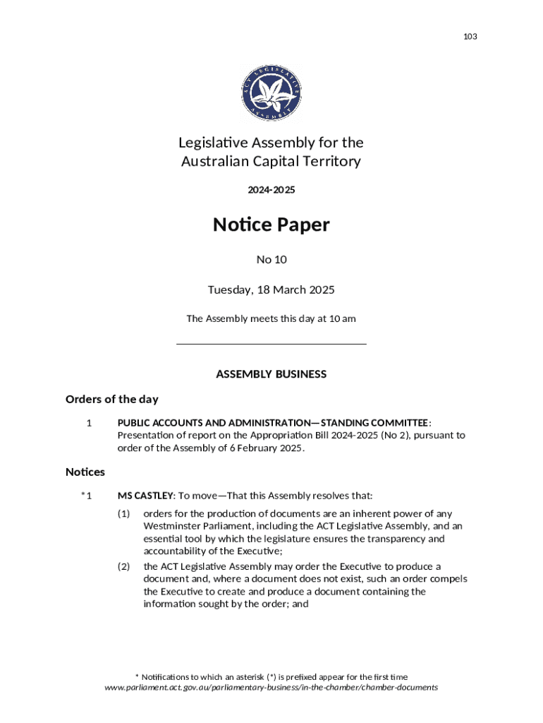 The Notice Paper No 10 Form constitutes an essential document in various legal and organizational processes. Primarily used for the notification of specific actions or decisions, it serves to formally communicate intentions within administrative frameworks. A well-prepared Notice Paper No 10 can provide clarity and ensure compliance with necessary protocols, hence its significance in both legal and organizational contexts.