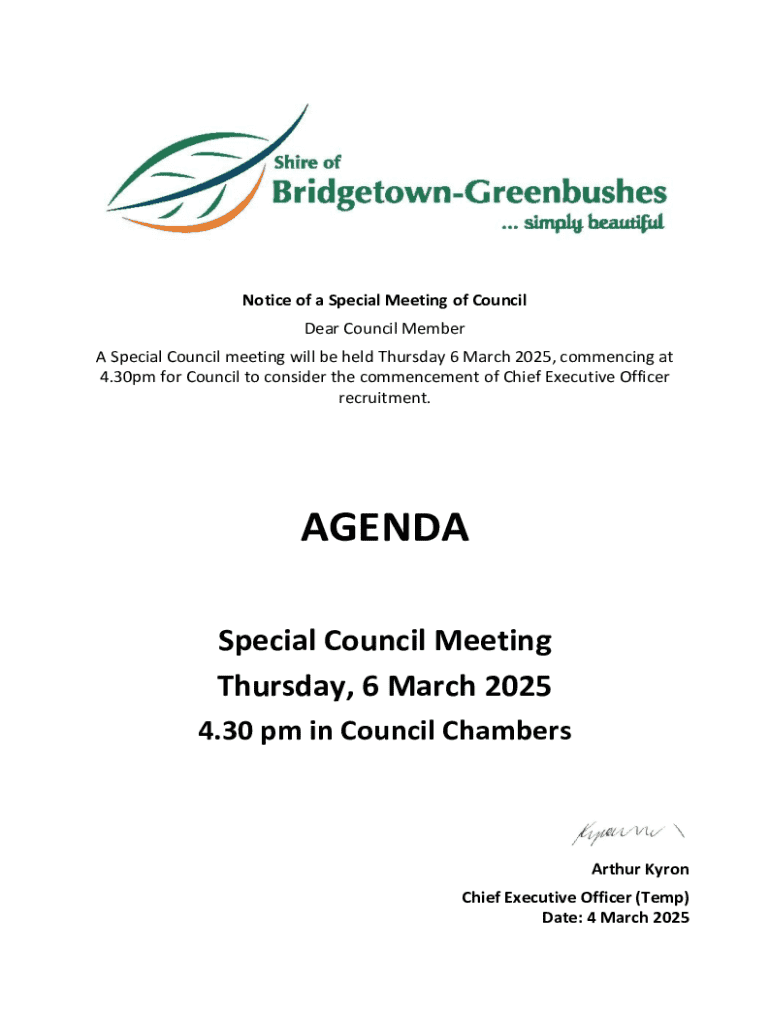 Get the free Notice of a Special Meeting of Council