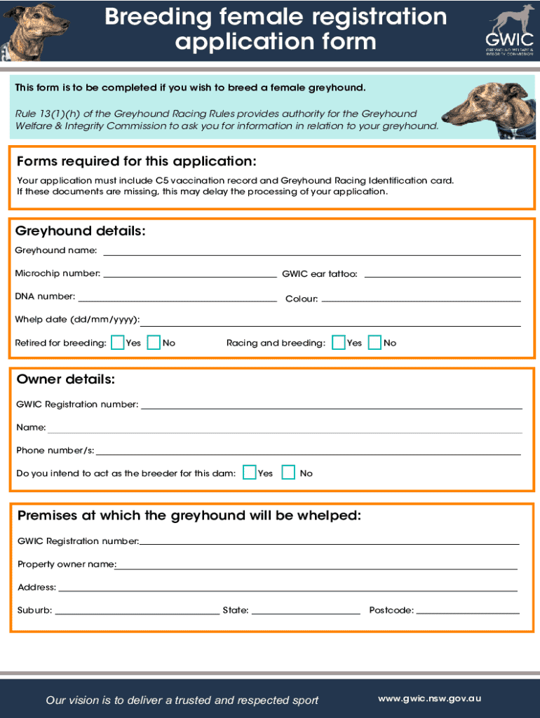 This form is used to register a female greyhound for breeding, requiring details about the greyhound, owner, and veterinary examination.