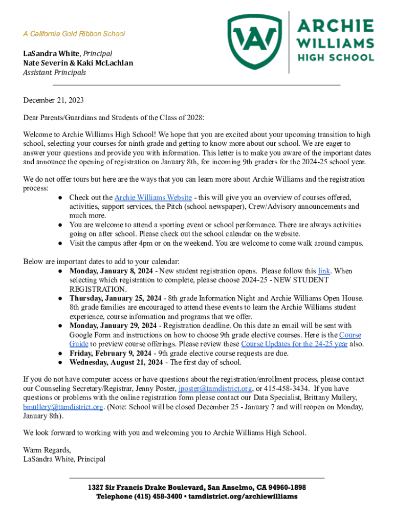 This document serves as a welcome letter for incoming 9th-grade students and their families at Archie Williams High School, providing important dates and information regarding the registration process