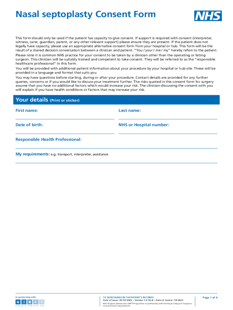 Filling out the nasal septoplasty consent form should be a straightforward process. Start by providing accurate patient information, including your name, date of birth, and contact details. Following this, you will need to detail your medical history, listing any pertinent conditions, medications, or previous surgeries. This information is vital, as it aids healthcare providers in ensuring your safety throughout the procedure.