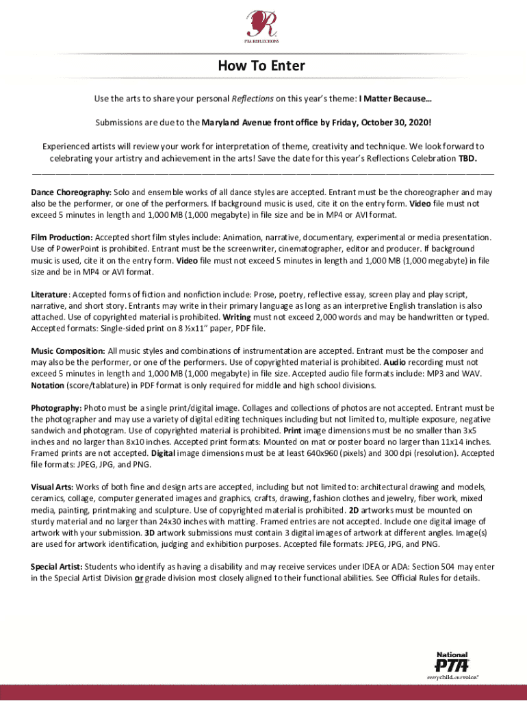 The National PTA Reflections Program often raises questions among participants. Understanding these FAQs can help you navigate the process smoothly. For instance, it's common for prospective participants to wonder about the necessity of being a PTA member to participate; indeed, students can participate regardless of membership status. Another question frequently posed is whether students can submit collaborative entries. The answer is yes, students are allowed to work together on submissions in some categories.