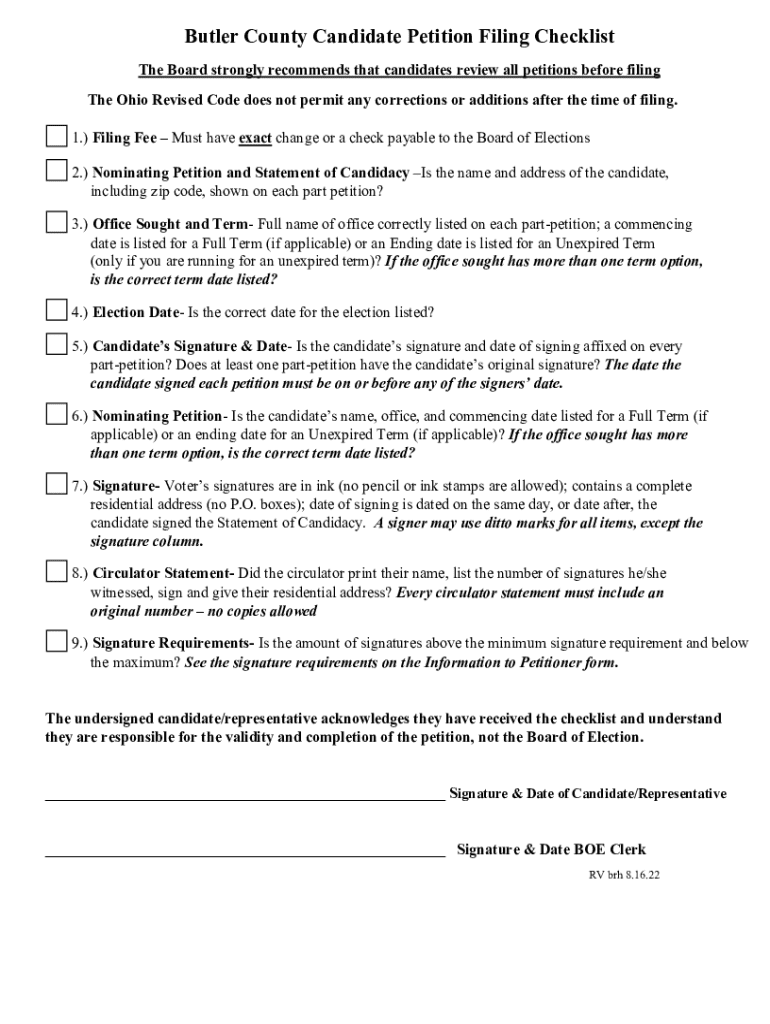 This checklist is designed for candidates to ensure their petitions are properly completed according to the Ohio Revised Code before filing with the Board of Elections.