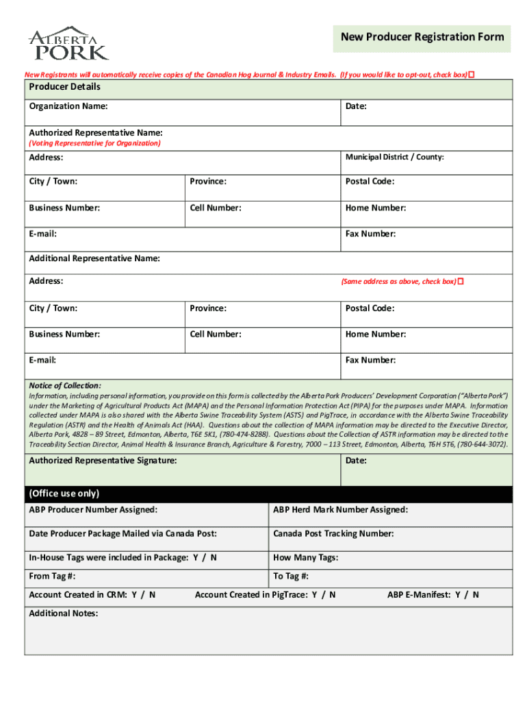 A form for new producers to register with the Alberta Pork Producers’ Development Corporation, providing information about their production type, premises, and authorized representatives.