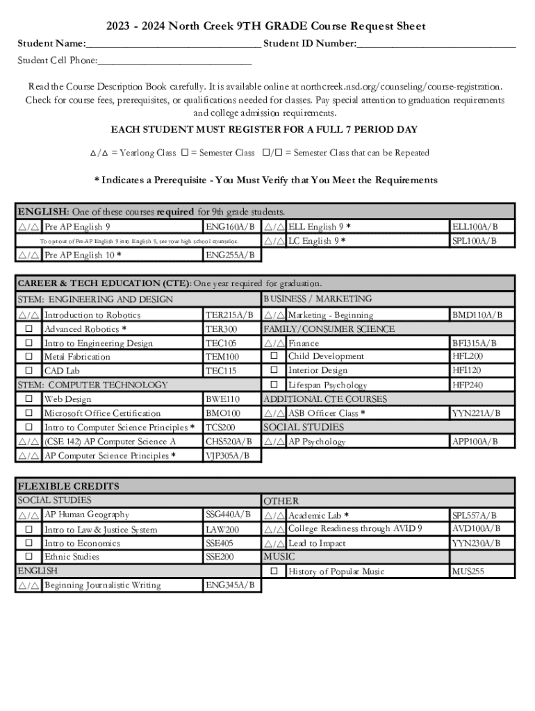 A document for 9th-grade students at North Creek to request their course selections for the academic year, including requirements for graduation and prerequisites for specific classes.