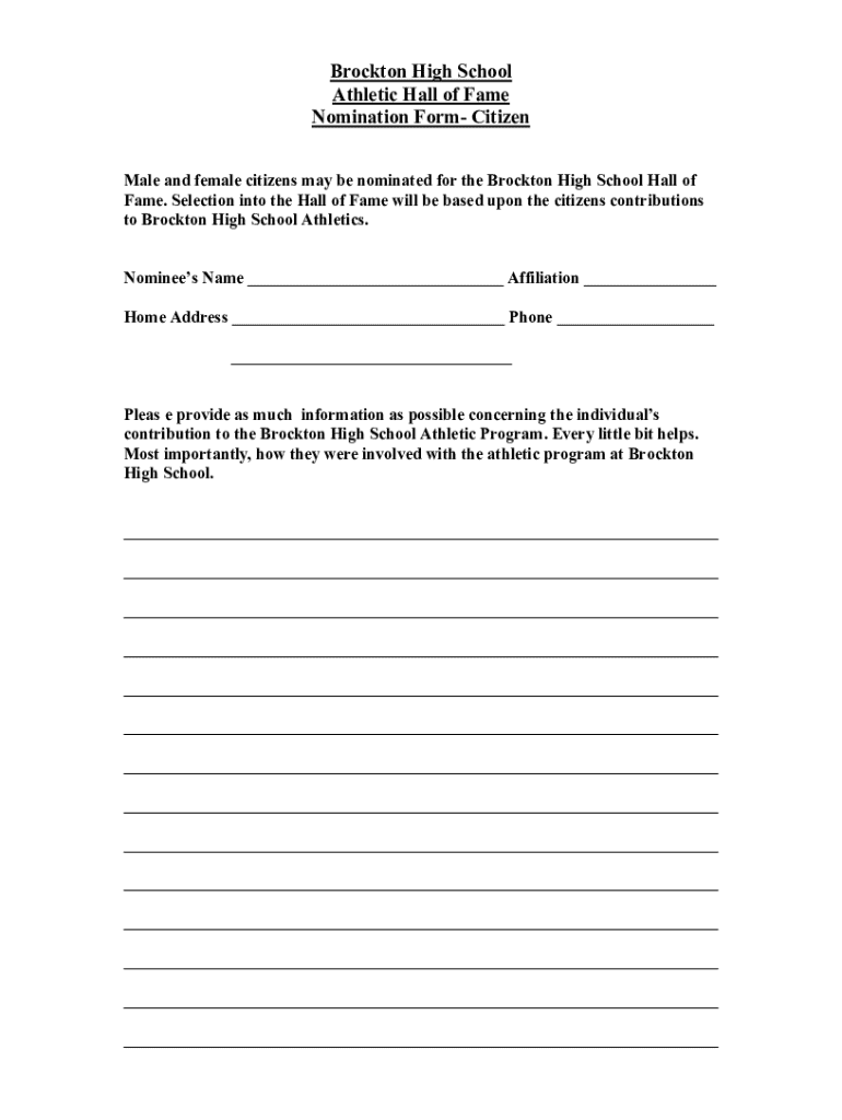 This document serves as a nomination form for citizens who have contributed to the athletic program at Brockton High School, allowing individuals to detail the nominee\'s contributions and involvement.