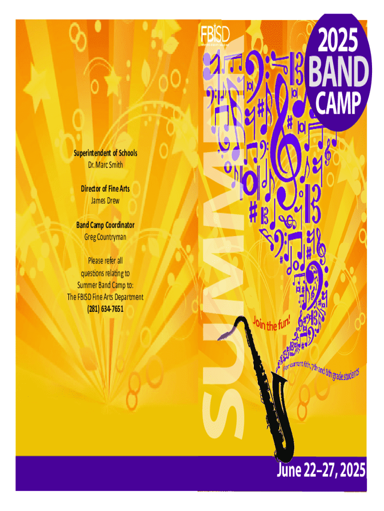 The FBISD 2025 Band Camp is designed to nurture and develop student musicians through a structured program aimed at improving musical skills and fostering teamwork. This camp serves as a bridge for students to refine their talents, engage in collaborative activities, and make lasting memories with peers passionate about music. Students will have the opportunity to learn from experienced instructors, participate in a variety of musical workshops, and perform in groups.
