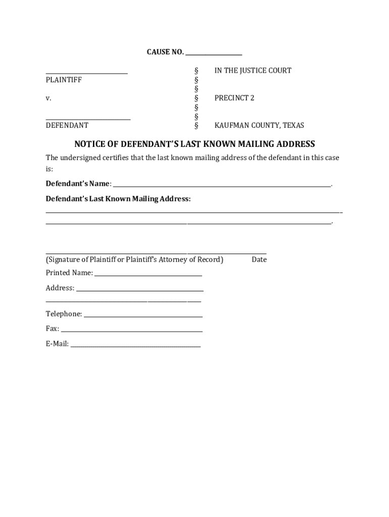 Get the free Notice of Defendant’s Last Known Mailing Address