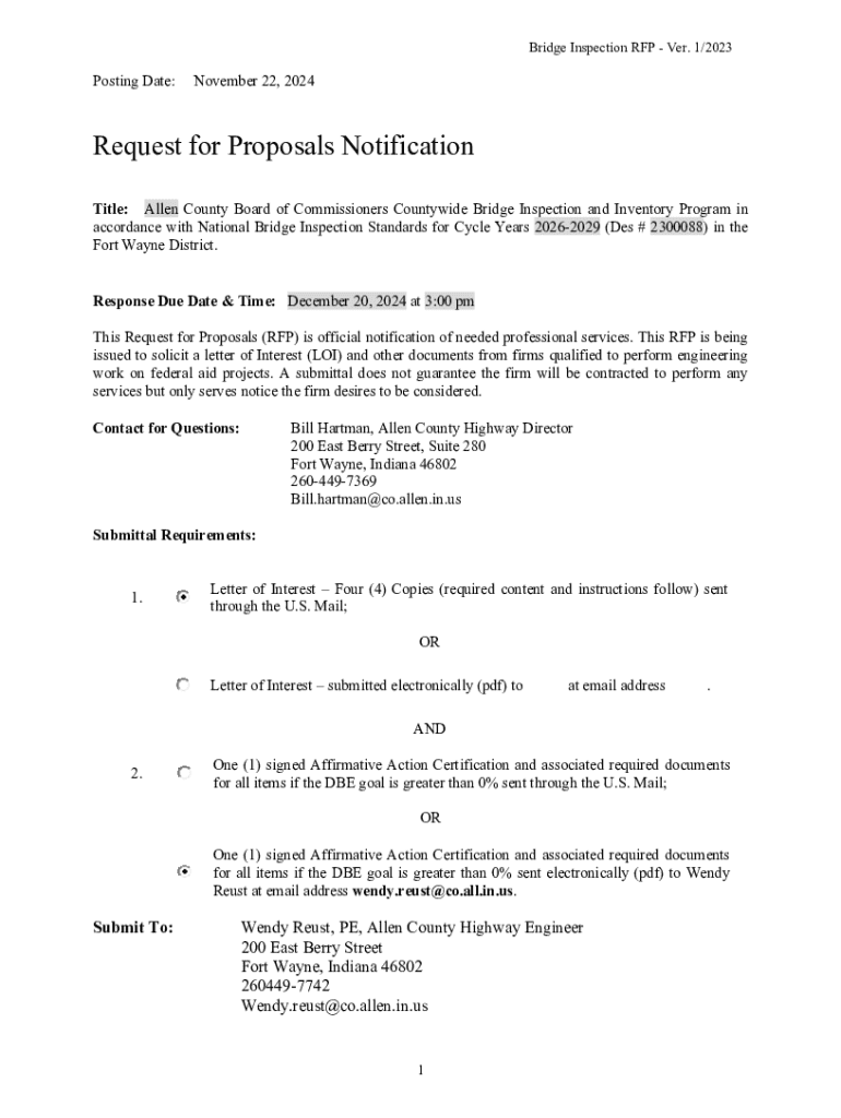 When it comes to submitting your bridge inspection RFP form, following the correct format and file guidelines is imperative. Generally, accepted submission formats include PDF and Word documents. Ensuring compatibility with the reviewing software used by the governing body is a vital step to prevent submission issues.