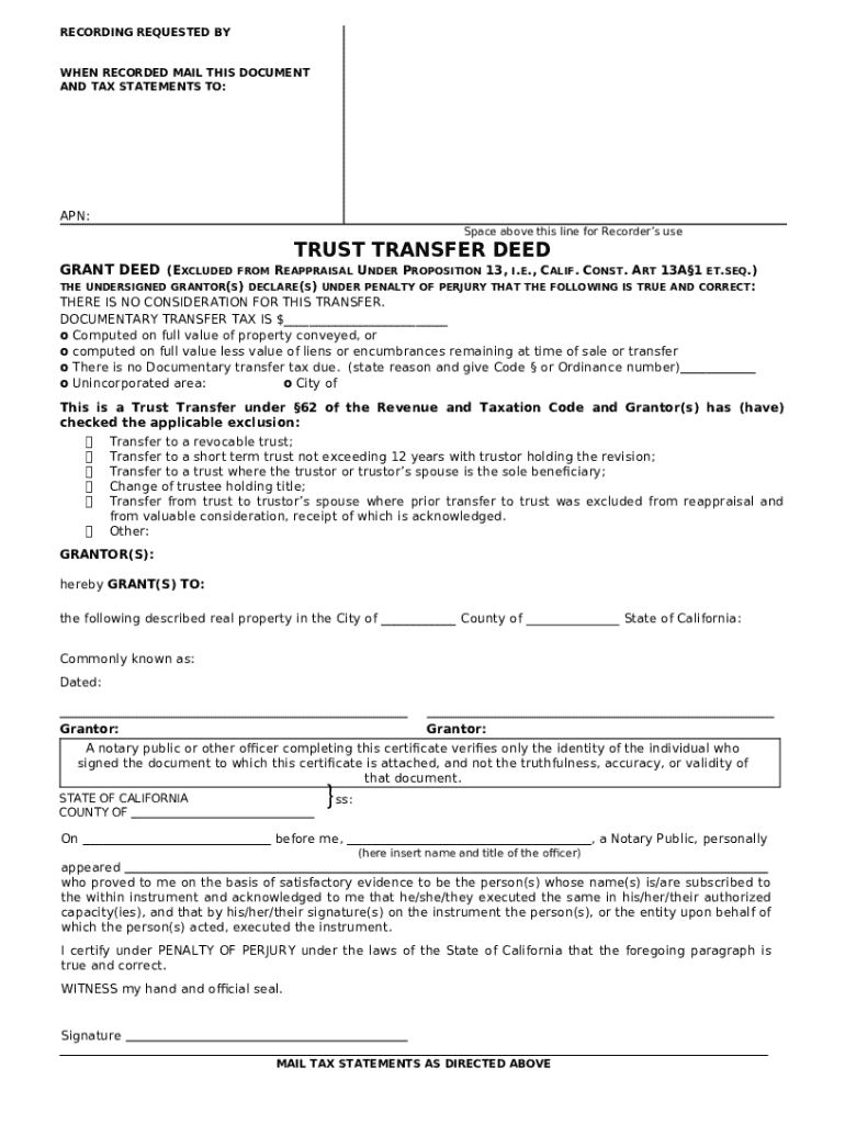 Employing a trust transfer deed not only aids in asset management but also affords beneficiaries better protection. By formally transferring assets to a trust, the trustor can dictate terms that govern how and when the assets will be distributed, thereby providing security and peace of mind for both trustors and beneficiaries.