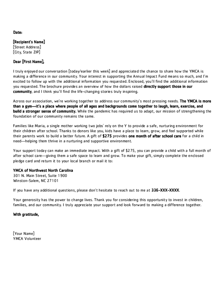 A follow-up letter from a YMCA volunteer to a potential donor, discussing the impact of donations on community services and providing information on making a pledge to support the YMCA\'s programs.