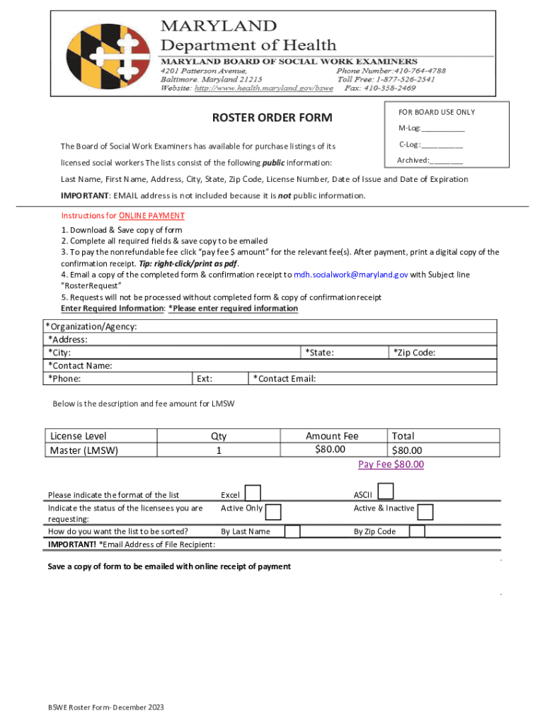 The BSWE roster form is an essential document utilized within the social work profession, specifically designed for the Board of Social Work Examiners (BSWE). This form plays a crucial role in facilitating the licensing and educational verification process for social workers across various jurisdictions. The importance of the BSWE roster form cannot be overstated, as it ensures that all practicing social workers meet the stipulated educational and professional standards required for licensure.