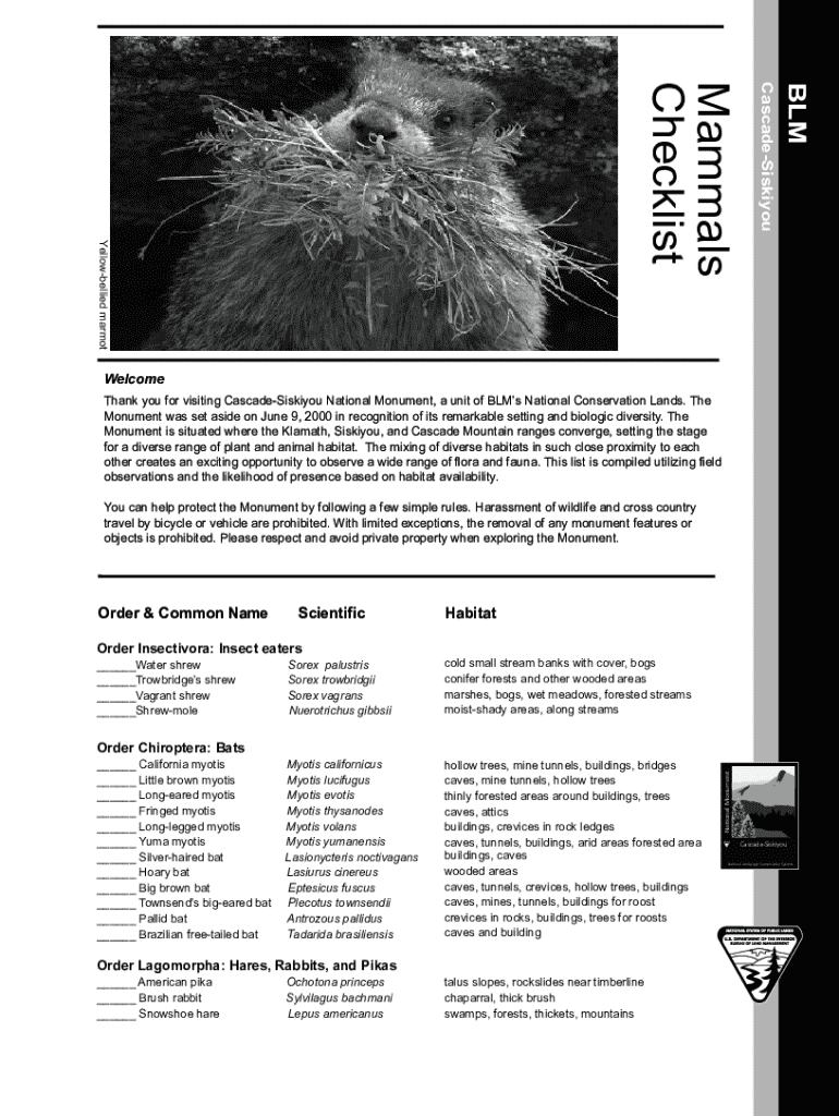 Cascade-Siskiyou Mammals Checklist is not the form you're looking for?Search for another form here.