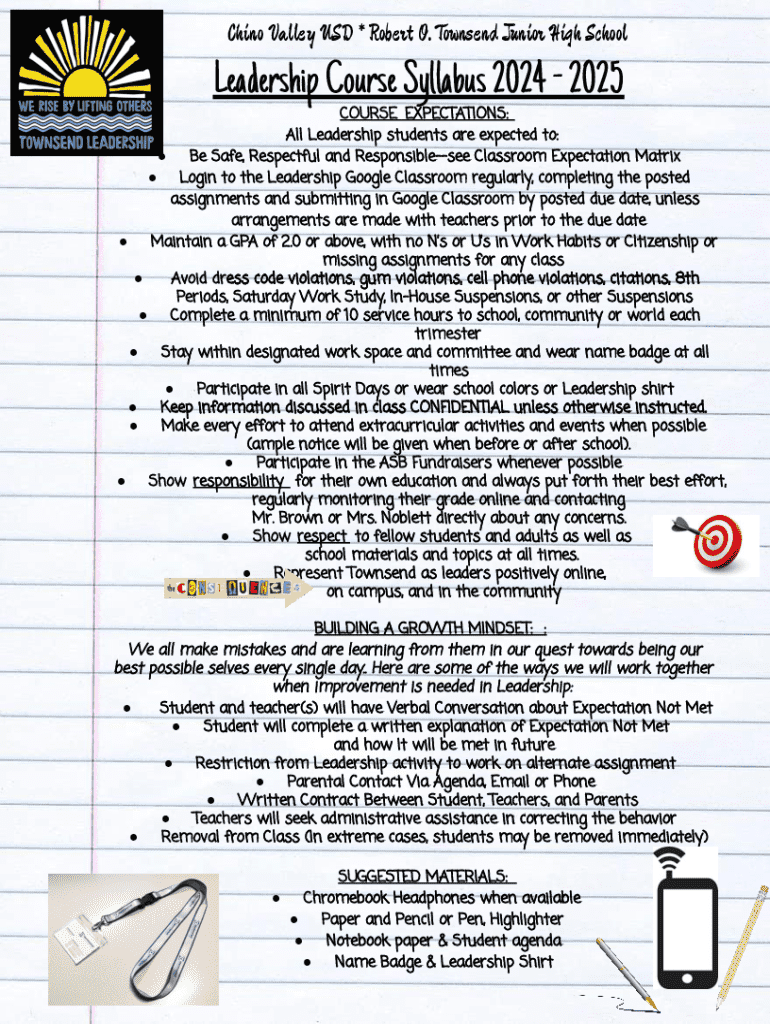 This document outlines the expectations, grading criteria, and requirements for students enrolled in the Leadership course at Robert O. Townsend Junior High School.