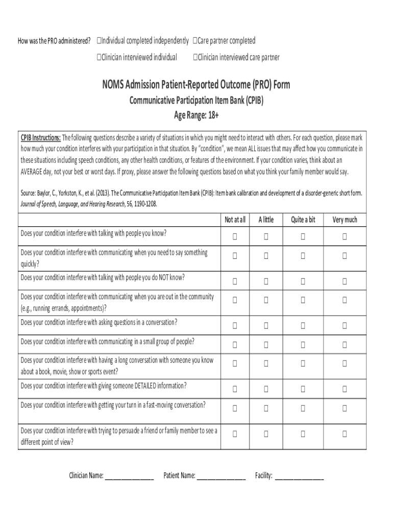The NOMS Admission Patient-Reported Outcome Form is designed to evaluate an individual\'s communication abilities and the impact of their condition on their participation in various social and community