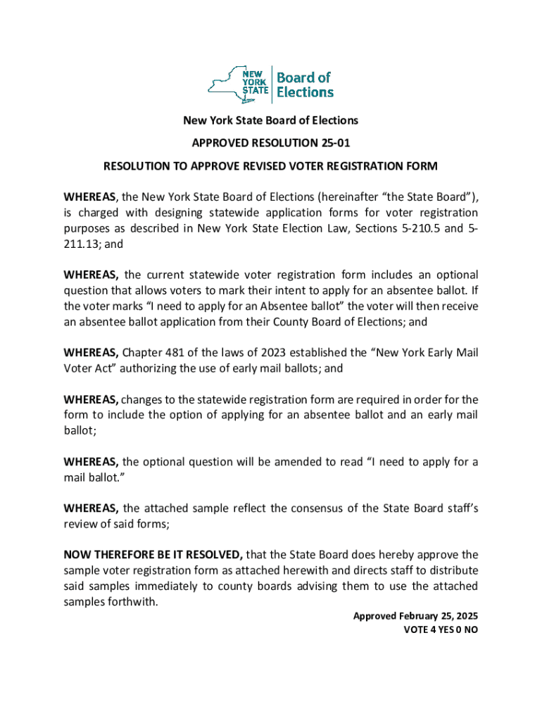 This document is a voter registration form used in New York State, allowing individuals to register to vote, update their registration information, and apply for mail ballots.