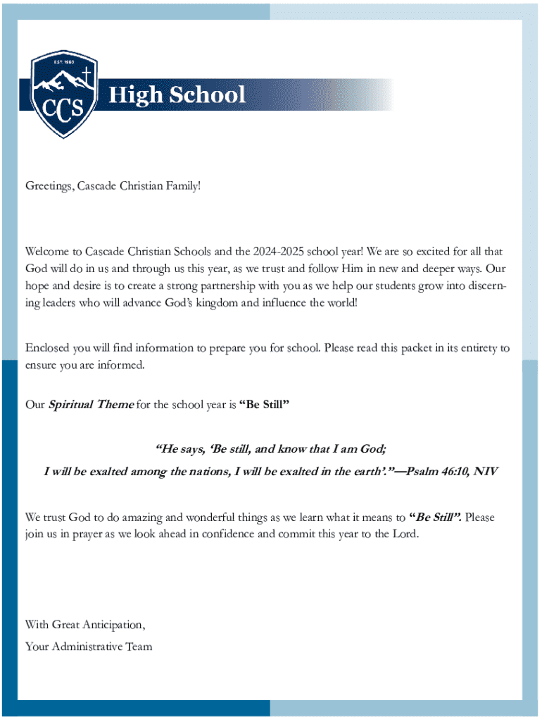 Get the free Cascade Christian Schools Family Information Packet 2024-2025