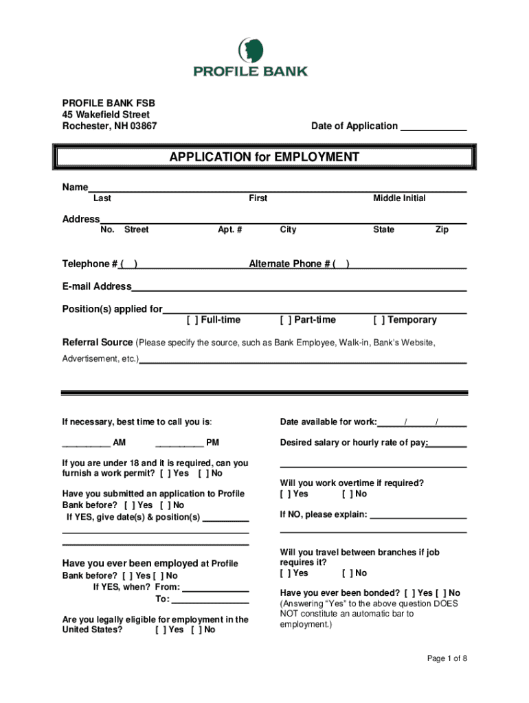 This document is used by applicants to apply for employment at Profile Bank, including personal information, employment history, and consent for background checks.