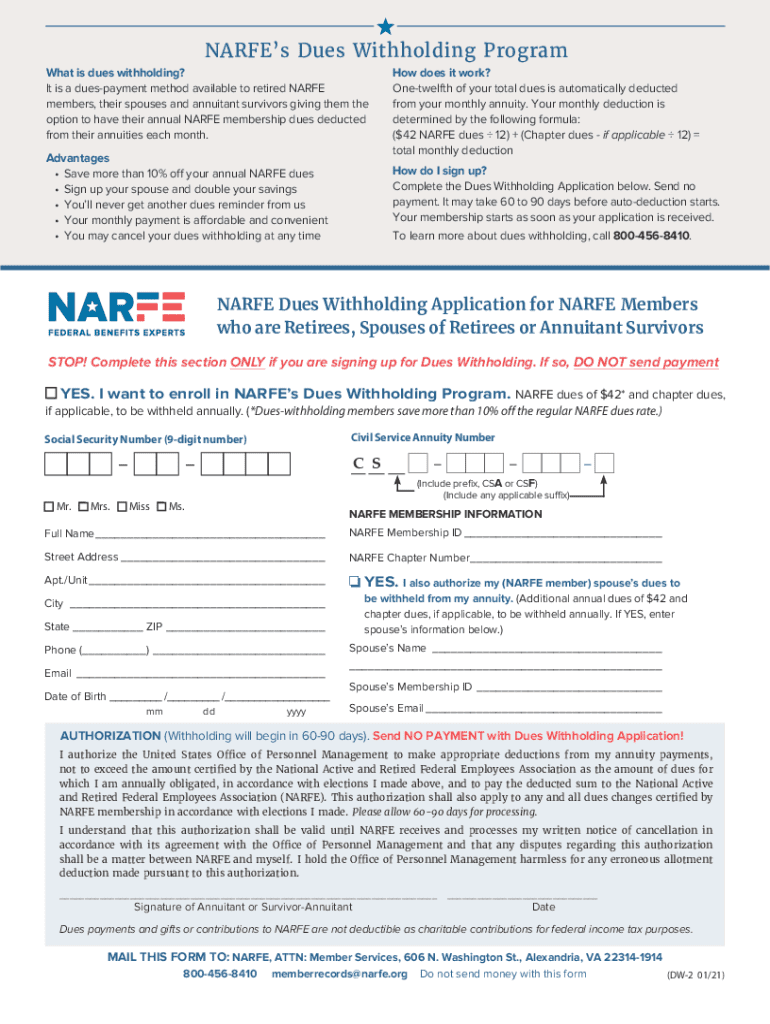 The NARFE dues withholding application is a form that allows members of the National Active and Retired Federal Employees Association (NARFE) to authorize the automatic withholding of their membership dues from their retirement benefits.