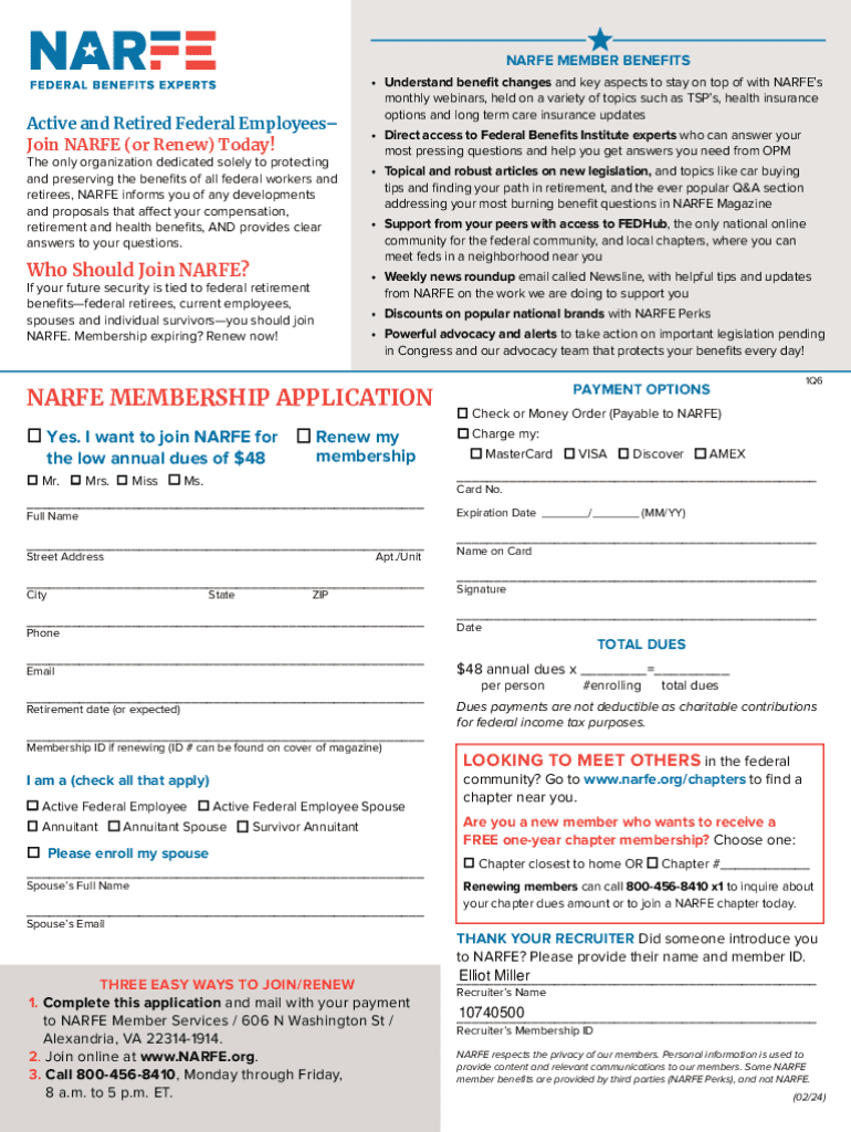 This document serves as an application form for individuals to join or renew their membership in NARFE (National Active and Retired Federal Employees Association), providing access to federal employee