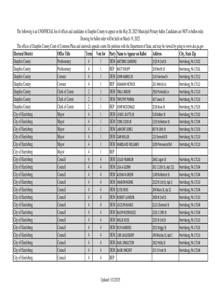 Get the free Dauphin County Municipal Primary Ballot Candidate List