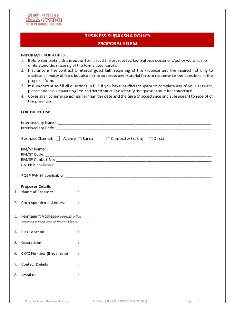 To fill out a business suraksha policy proposal, individuals should gather necessary information about their business, including ownership details, financial data, types of coverage needed, and any existing insurance policies. They should then complete the proposal form accurately and submit it to the insurance provider.