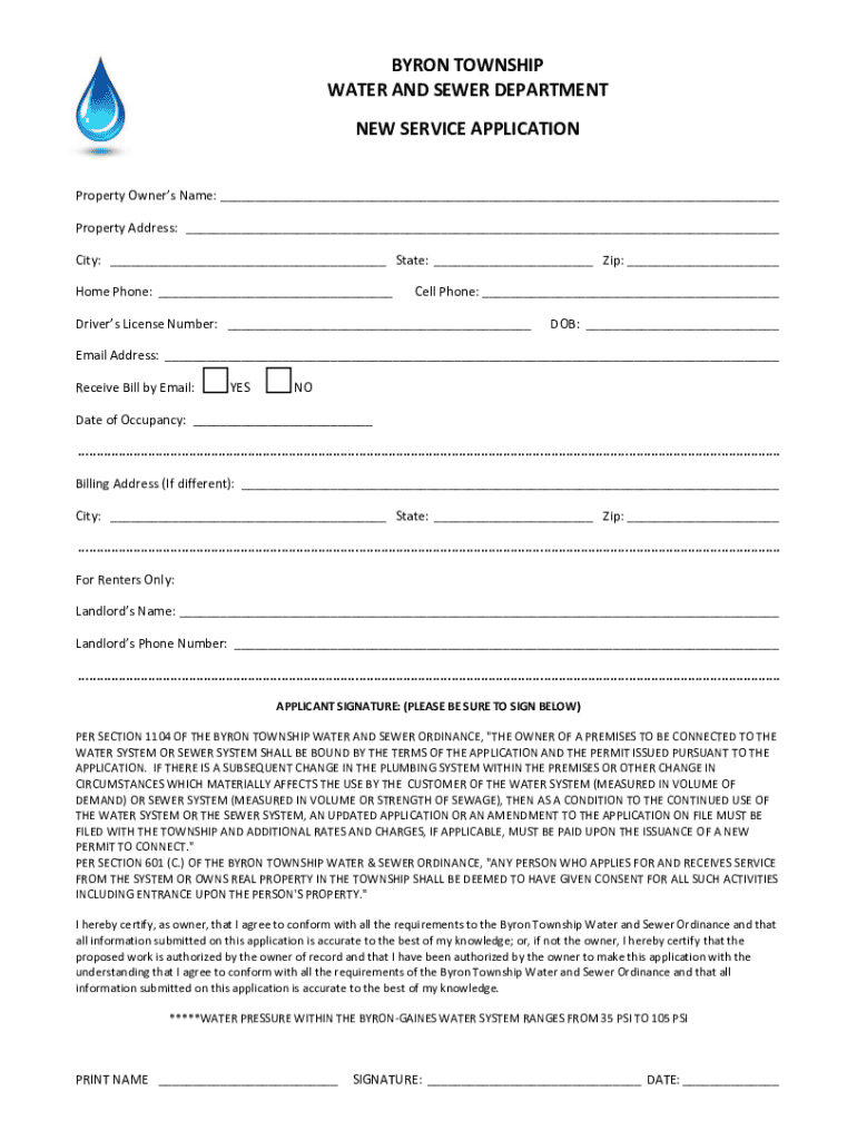 Application form for new water and sewer services provided by Byron Township, requiring property and personal information from the applicant.