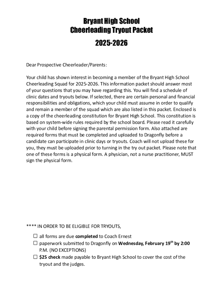 Get the free Bryant High School Cheerleading Tryout Packet